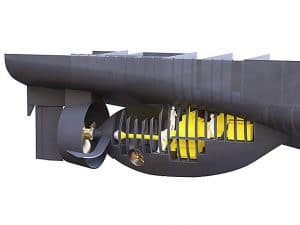 Double skeg drive offers greater thrust with less input power. This is possible thanks to the use of larger screws with the shaft rotating at low speed and minimizing mechanical losses.